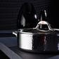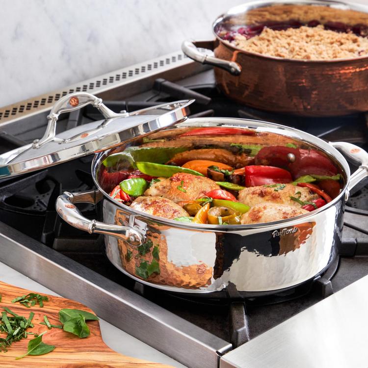 Made with best-in-class clad stainless steel: a thick core of superconductive aluminum alloy guarantees great responsiveness, ensuring food will not burn or overcook. The inside is lined in mirror-polished stainless steel, practical and easy to clean, whilst the external stainless steel layer is hammered by our master artisans to ensure lasting beauty. The handles, comfortable yet elegant, are inlaid with the signature Ruffoni copper coin.