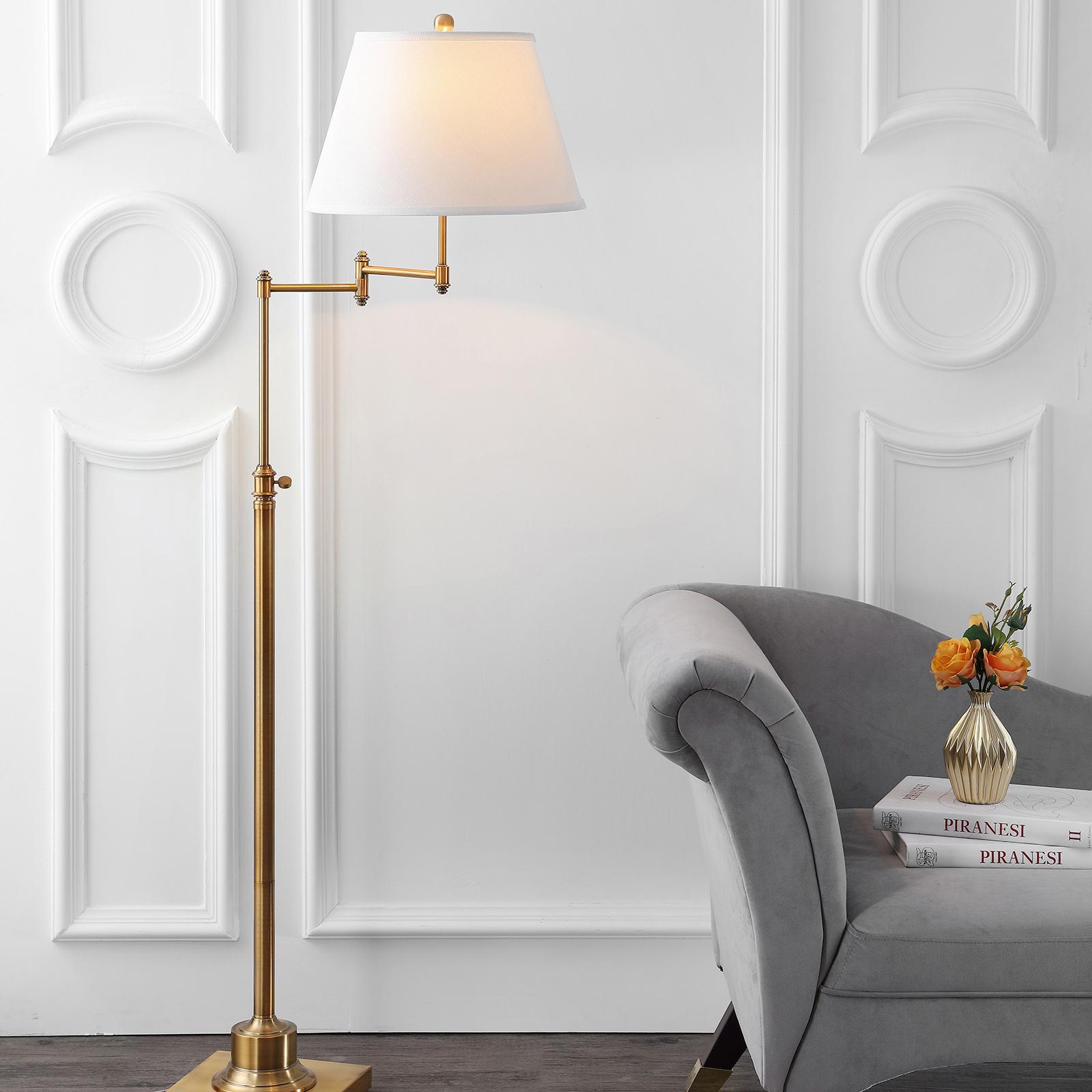 Inspired by an antique telescoping lamp, this adjustable swivel floor lamp with a lustrous finish is handsome with a new traditional vibe. This articulating lamp with white textured cotton shade is easy to adjust for reading or ambient light in any room.