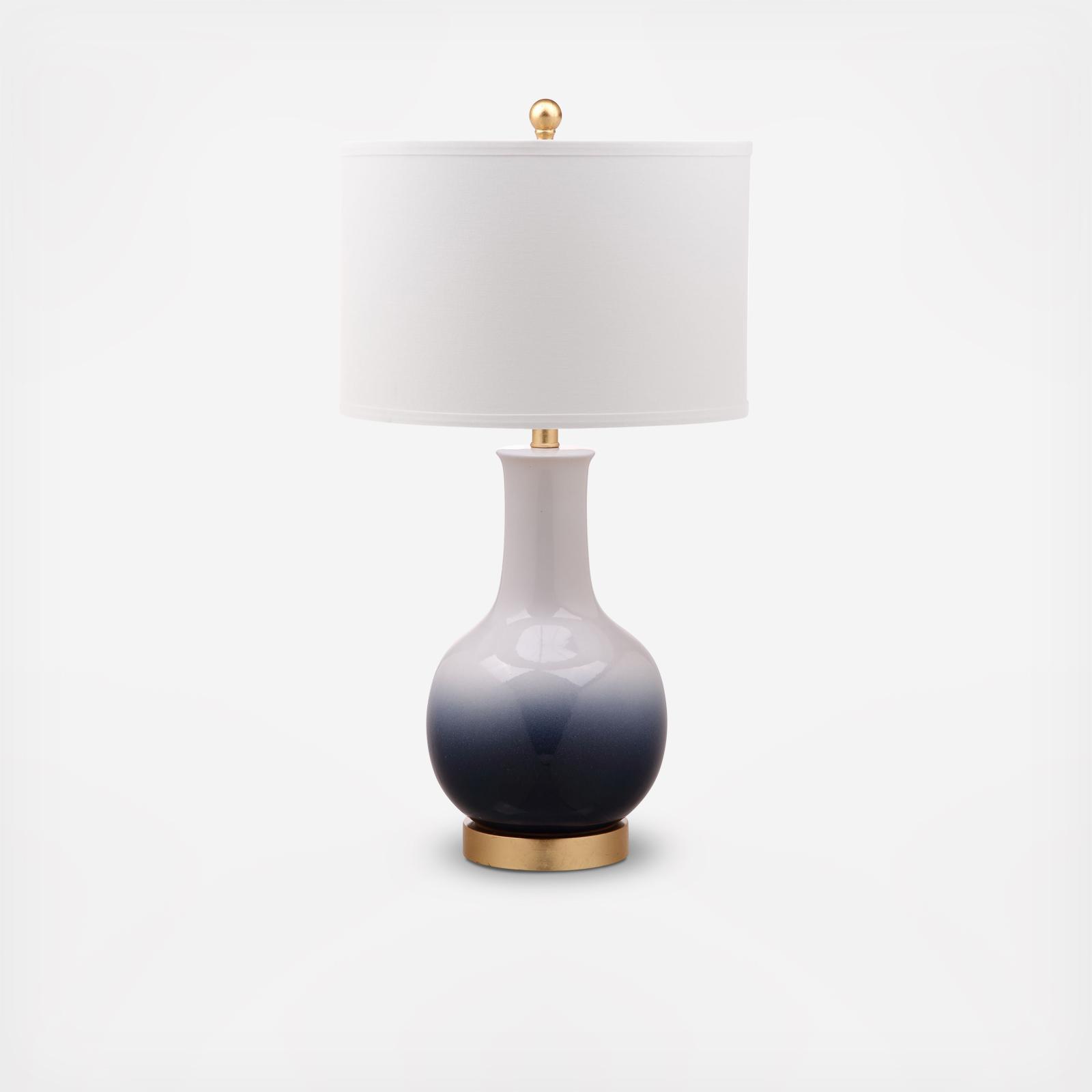 Add modern magic to any living room or bedroom with this contemporary table lamp. Its genie-style ceramic body features smooth curves finished in a chic hue. Designers embrace the depth and dimension of its gold metal finish and white linen shade.