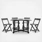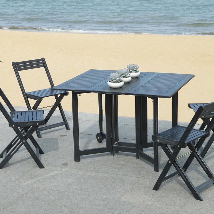 An ingenious space saver, arvin outdoor dining table and chair set is designed for gracious outdoor living. Crafted of eco-friendly black acacia wood, its 4 director-style chairs fold and tuck under a foldable rectangular table for easy storage.