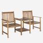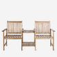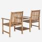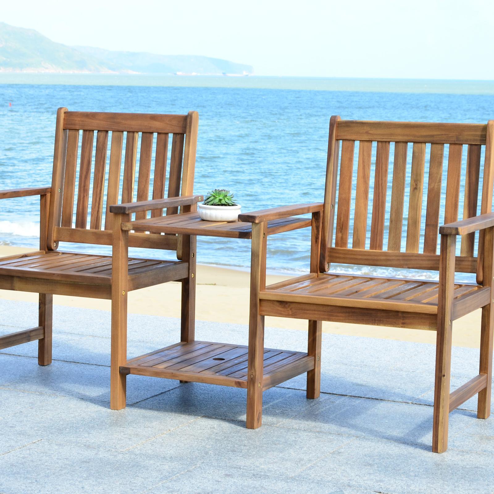 An eco-friendly conversation piece, this sweet twin seat outdoor bench is recalls hand-hewn Shaker furniture, but for outdoor use on porch or patio. Crafted of sustainable acacia wood in grey, it comes with its own umbrella-ready drink table.