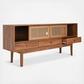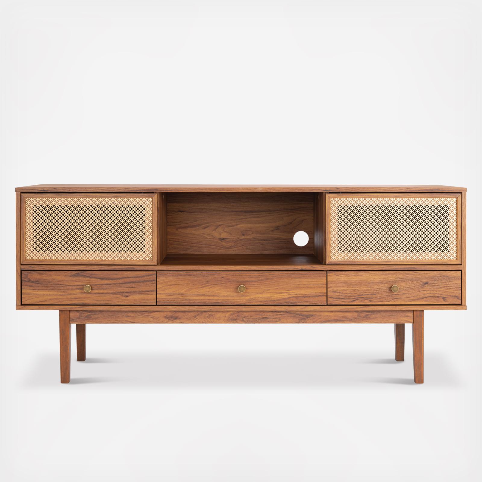 Rich tones and traditionally inspired details give this contemporary Ceu 3 Drawer Media Stand its elegant character. Ceu’s walnut finish is beautifully highlighted by intricate gold guilloche lattices that frame its open shelf, providing stylish, easy access storage in any living room or entertainment area.