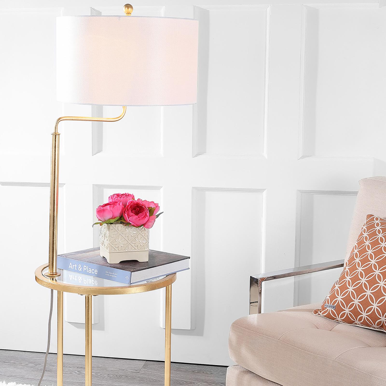 Inspired by the newly renovated lounge in Manhattan’s grandest hotel, this floor lamp side table is ideal for the modern living room. Imbued with style and substance, its gold finish envelopes the sleek lines of the lamp and built-in glass side table.
