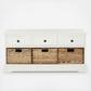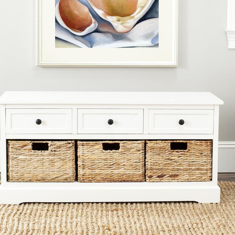 Keep clutter tucked away in the Damien 3-drawer storage unit offering stylish organization for entryways, family rooms and bedrooms. Crafted of sturdy pine with a vintage finish, Damien offers three handy drawers for smaller items above three ample wicker baskets that slide in and out for easy use. Minor assembly required.