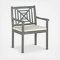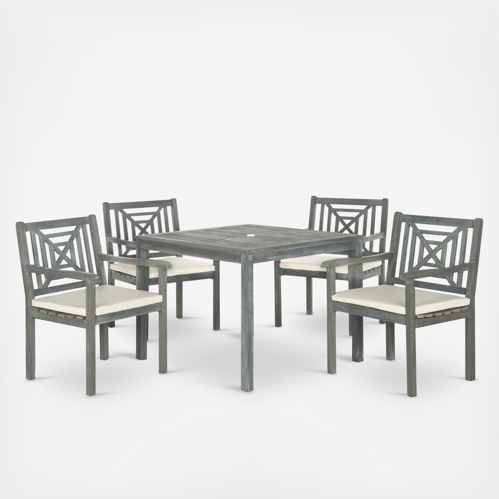 A motif of concentric squares adorned with a transitional X detail, adorns the chairs of the 5-piece Del Mar outdoor dining set. Masterfully crafted of sustainable acacia wood in ash grey, this sturdy furniture comes with beige all-weather cushions.