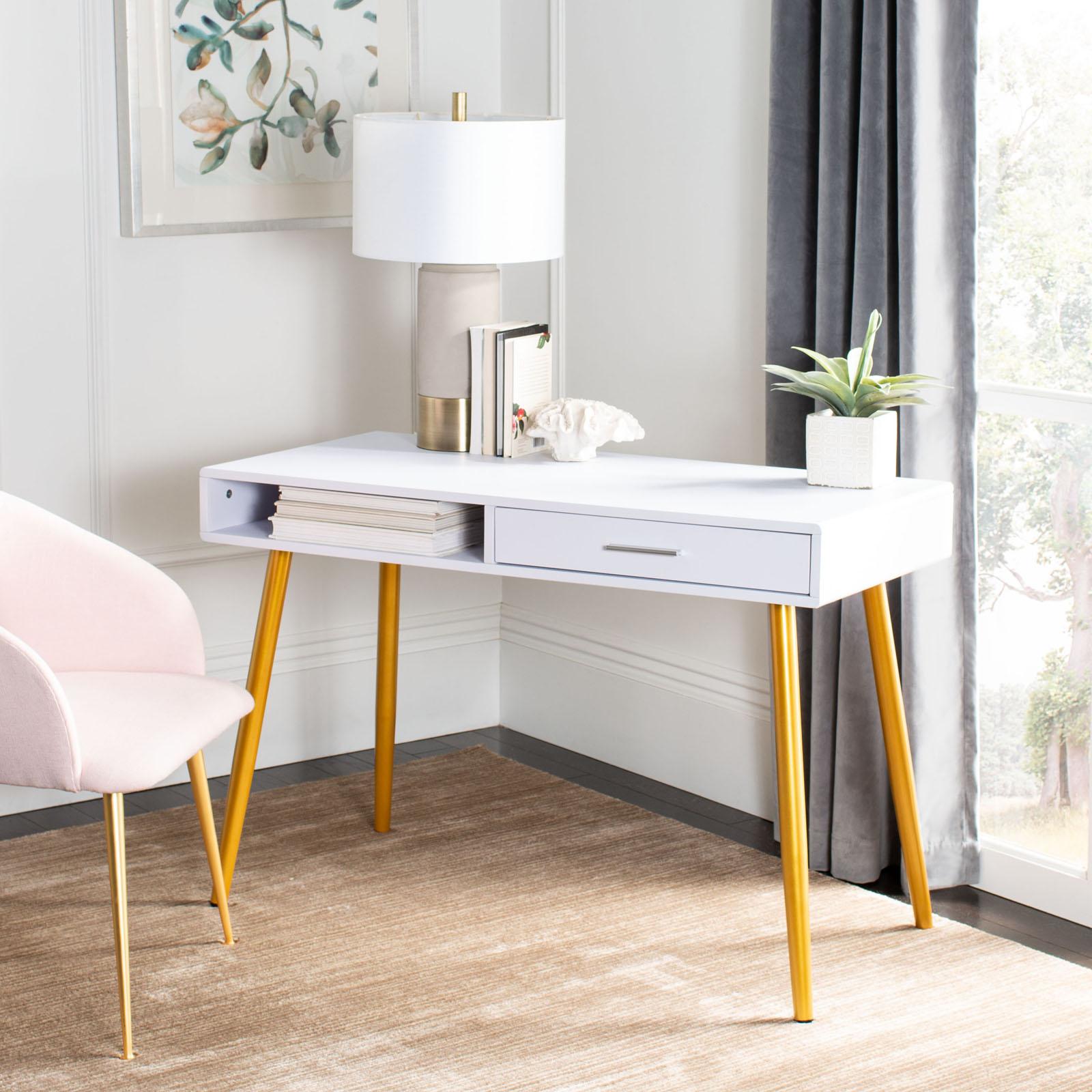 Reinvent any home office or study with this chic contemporary a drawer and a shelf desk. Sleek and sophisticated, its wood construction features generous hidden and open storage with metal tube legs adding classic vintage style.