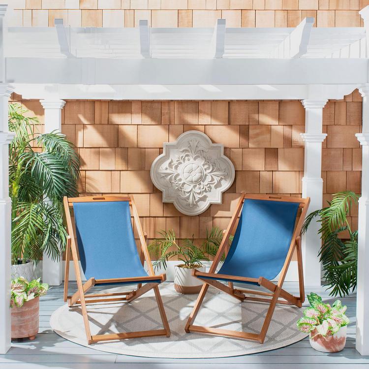 Relax and unwind with these contemporary foldable sling chairs. Crafted with the strength of galvanized steel and eucalyptus wood, it features a beautiful oiled teak finish that only gets better with age. Its chic striped seats make it a designer favorite.