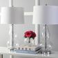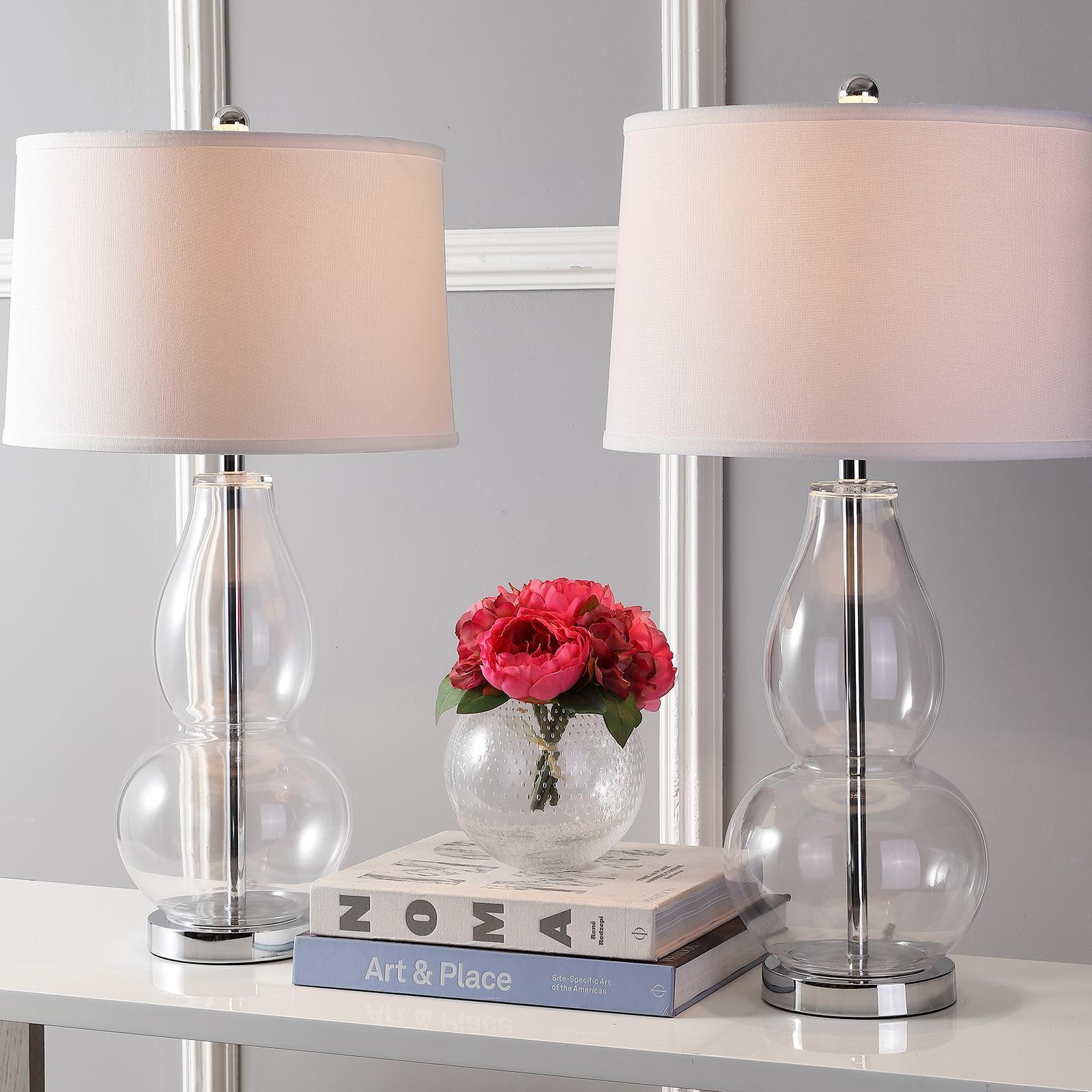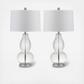 Old meets new in the Mercurio double gourd table lamp, with its classic shape and glass accented with chrome fittings. This set of two lamps is topped with an elegant drum shade in off-white for a fashion look in transitional rooms.