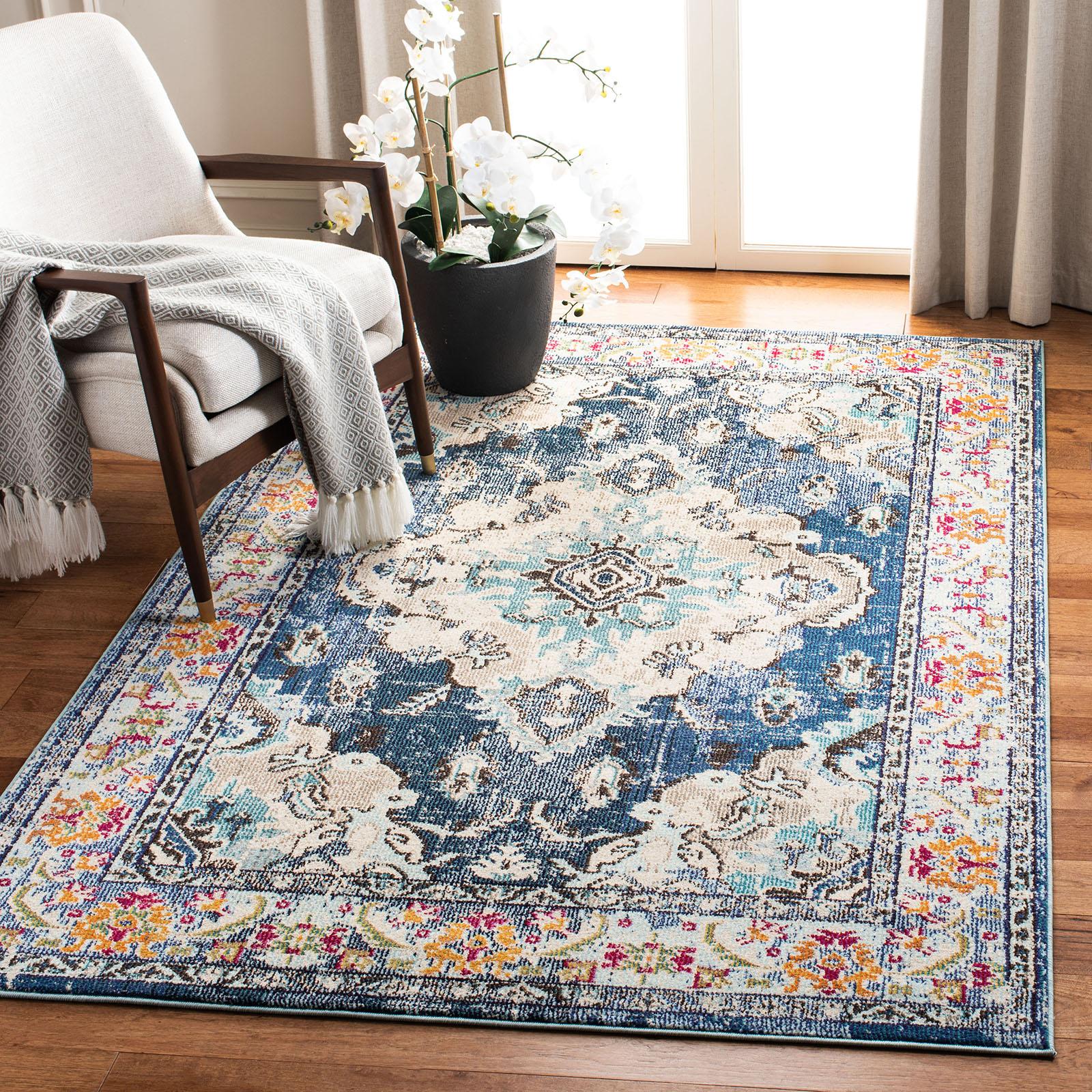 Free-spirited and vibrantly colored, the Safavieh Monaco Collection imparts boho-chic flair on fanciful motifs and classic rug designs. Contemporary decor preferences are indulged in the trendsetting styling and addictive look of Monaco. Power-loomed using soft, durable synthetic yarns creating an erased-weave patina that adds distinctive character to room decor.