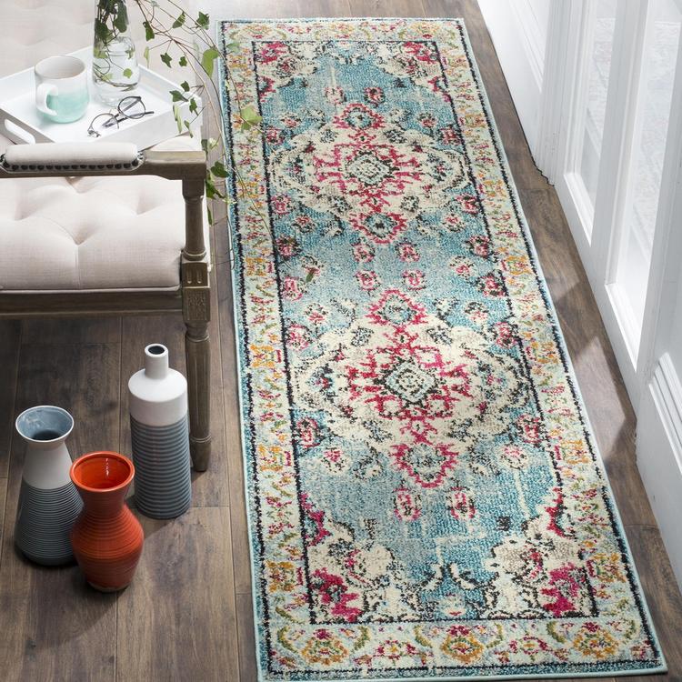 Free-spirited and vibrantly colored, the Safavieh Monaco Collection imparts boho-chic flair on fanciful motifs and classic rug designs. Contemporary decor preferences are indulged in the trendsetting styling and addictive look of Monaco. Power-loomed using soft, durable synthetic yarns creating an erased-weave patina that adds distinctive character to room decor.