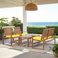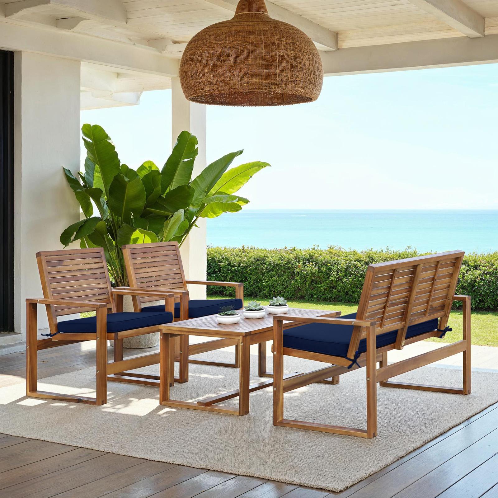 Give your outdoor spaces resort-chic comfort and style year round with the rustic Ozark 4-piece outdoor set. Crafted of weather resistant, sustainable acacia wood for enduring beauty, each piece is designed with a transitional update of the classic slatted outdoor furniture beloved in England for centuries. With its solid wood in natural coloration, and white upholstered cushions suitable for the toughest weather conditions, Ozark is the epitome of outdoor living.
