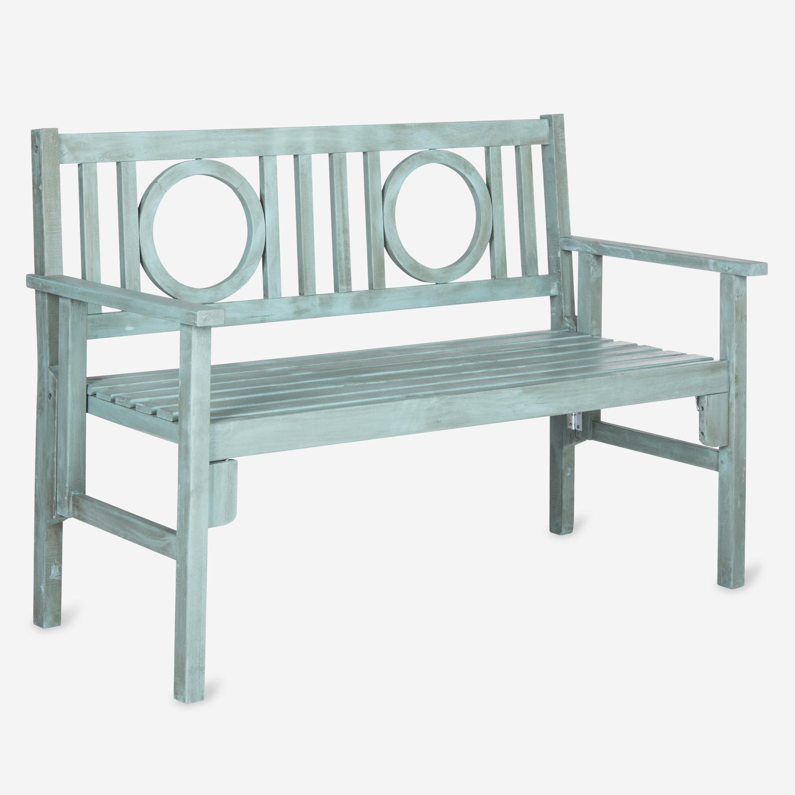 Pretty and practical, the Piedmont folding bench is a contemporary update of classic British garden seating. Circle insets distinguish a slatted seat back crafted of sustainable acacia wood in a beautiful finish, and seat slats insure quick drainage.