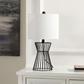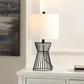 Bring sleek style and charm to your tabletop with this Rayna table lamp. This modern table lamp maintains a chic, industrial edge with a cage-style base. With a sleek and geometric profile, the lamp vouches for a stately and airy presence, sitting easy and gracefully on any tabletop. It is completed with a white drum shade to lend an eye-catching accent and softly diffused glow to your nightstand, console, or side table.