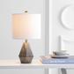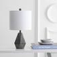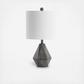 Bring mod style to any living room with this dramatic contemporary table lamp. Its sophisticated silver metal finish and geometric pattern add depth and dimension to its dark grey hue, while its complimentary off-white 100% cotton shade creates a bold contrast.