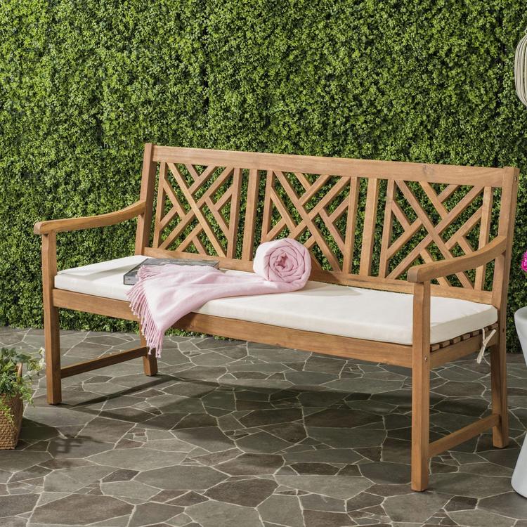 Inspired by furnishings in the regal gardens that surround Newport’s Gilded Age mansions, this 3 seat outdoor bench is a classic. Its traditional geometric design is highlighted by a beautiful finish and welcoming beige cushion.