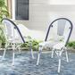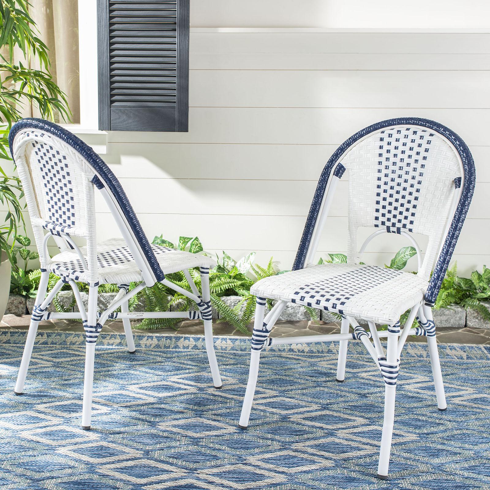 Raise a glass to country and coastal decorating with this navy and white set of stackable chairs. A chic addition to any patio or deck, this chair is inspired by classic European bistro stools and crafted of wicker and aluminum for easy care.