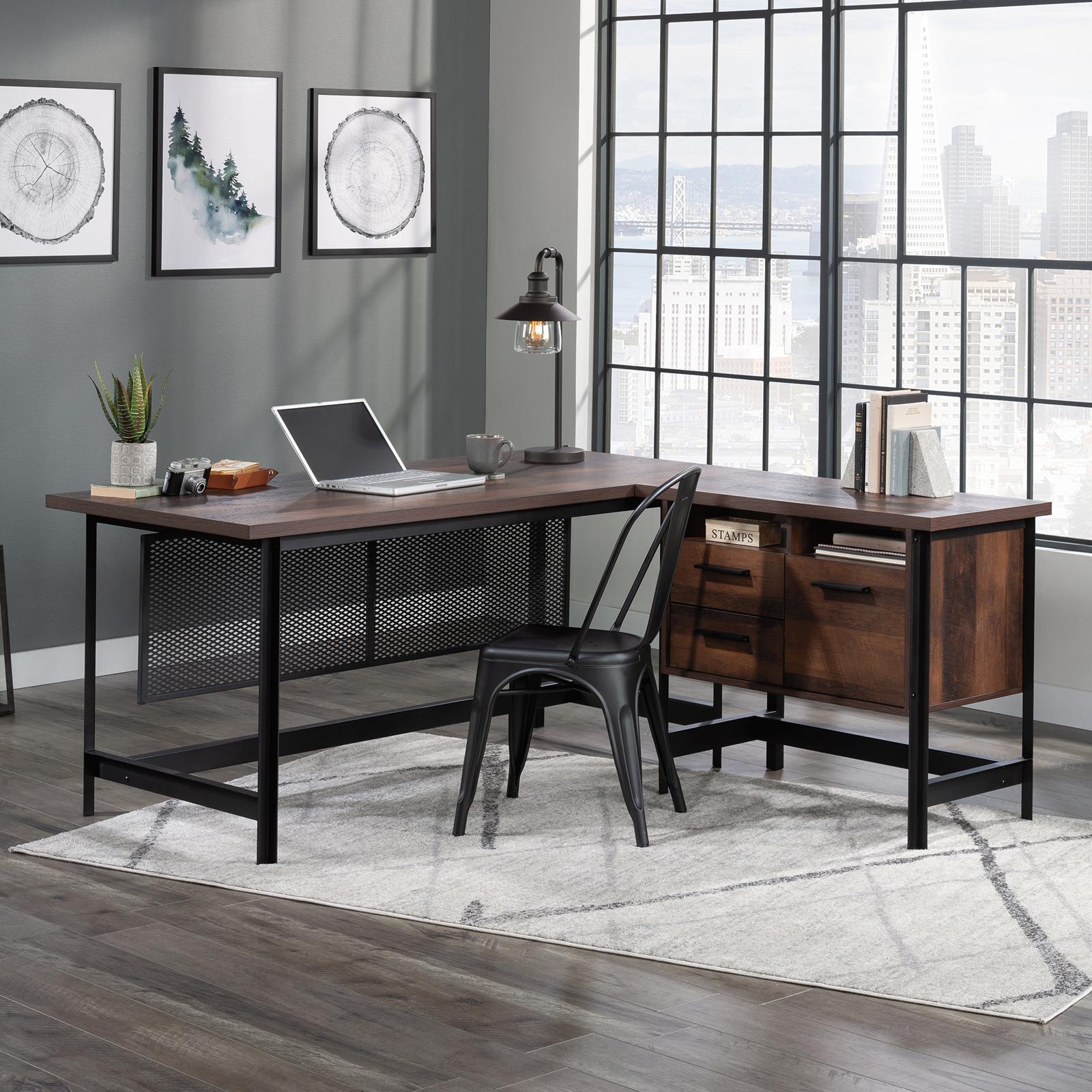 A spacious top surface and storage space makes this L-shaped desk from the Briarbrook collection an easy addition to your home office or corporate workspace. Three drawers on this L-shaped computer desk feature full extension slides, making storing your pens, sticky notes, business cards and more, as easy as can be. This L-shaped office desk features a file drawer that holds letter-size hanging files—ideal for your most important documents. Open cubby shelf areas for additional storage means your planner, to-do list, and more are never far out of reach. This L-shaped home office desk accommodates optional Hidden Wireless Qi Compatible Charger by Eggtronics 425905 (sold separately – visit sauder.com for more information) so your cell phone never runs out of a charge. A durable, powder coated metal and perforated modesty panel bring style and durability together in this L-shape office desk with storage. Finished on all sides for versatile placement in any room of your home or office, your L-desk will look polished from every angle. A dark Barrel Oak finish creates a comfortable, familiar feel whether you are working from home or in the office space.