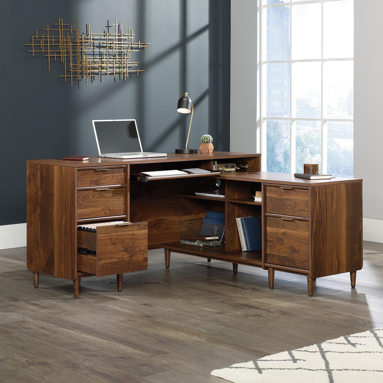 Cubby storage as far as the eye can see! Never run out of convenient storage and workspace with this L-shaped desk from the Clifford Place collection. This L-shaped office desk includes a slide-out keyboard/mouse shelf with metal runners and safety stops to keep your generous top surface space clear for items like a laptop, lamp, photos of your family and more. Two larger bottom drawers with full extension slides hold letter-size hanging files, so your important documents are never lost again. This L-shaped home office desk includes three storage drawers with metal runners and safety stops to store items like pens, sticky notes, letter openers, and more. The desk return can be fastened to either the left or right side, making mid-century modern desks like this one, adaptable for your home. Cord clutter is never a problem because this L-shaped desk with drawers includes grommet holes and pass-throughs for easy cord managements. Finished on all sides for versatile placement, this L-shaped desk with storage looks polished from every angle. Cubbyhole storage and solid wood feet are just some extras that make this home office desk unique and eye catching.