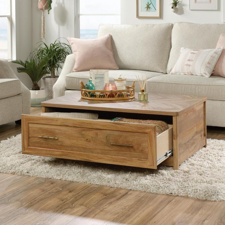 Add some visual interest to your living room with the Coral Cape Coffee Table, complete with a herringbone patterned top. A large drawer features full extension slides for easy access to living room essentials while the cubbyhole storage makes the perfect home for décor.