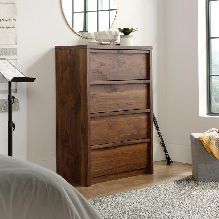 Tuck away your wardrobe in minimalist style with this 4-drawer chest from the Harvey Park collection. Find room for your array of blouses and slacks in one of the four drawers in this bedroom chest of drawers that open and close on smooth metal runners. These four drawers are spacious enough to hold your comfiest sweatshirts, thickest denim, or biggest duvet comforter. A T-lock drawer assembly system makes putting together this 4-drawer dresser as easy as can be. Use the top surface of this wood chest of drawers for displaying your jewelry, perfume bottles, or photos of your family.