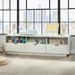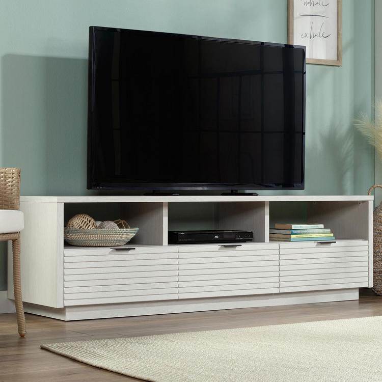 Make your home the place to be with this TV credenza from the Harvey Park collection. This modern TV stand with drawers accommodates up to a 70” TV weighing 95 lbs. or less, making it the perfect spot for all-day movie marathons, binge watching your favorite show or playing endless hours of video games with your friends. This credenza TV stand can be used in any room of your home to display your favorite home décor items like decorative plants, your array of knick-knacks and photos of your family and friends too. This entertainment credenza features three open storage cubbies that are perfect for storing and displaying items like stacks of books, board games, organizing bins and your video/gaming consoles. Three drawers that open and close on smooth metal runners create convenient storage for TV remotes, extra charging cables, video games, and more.