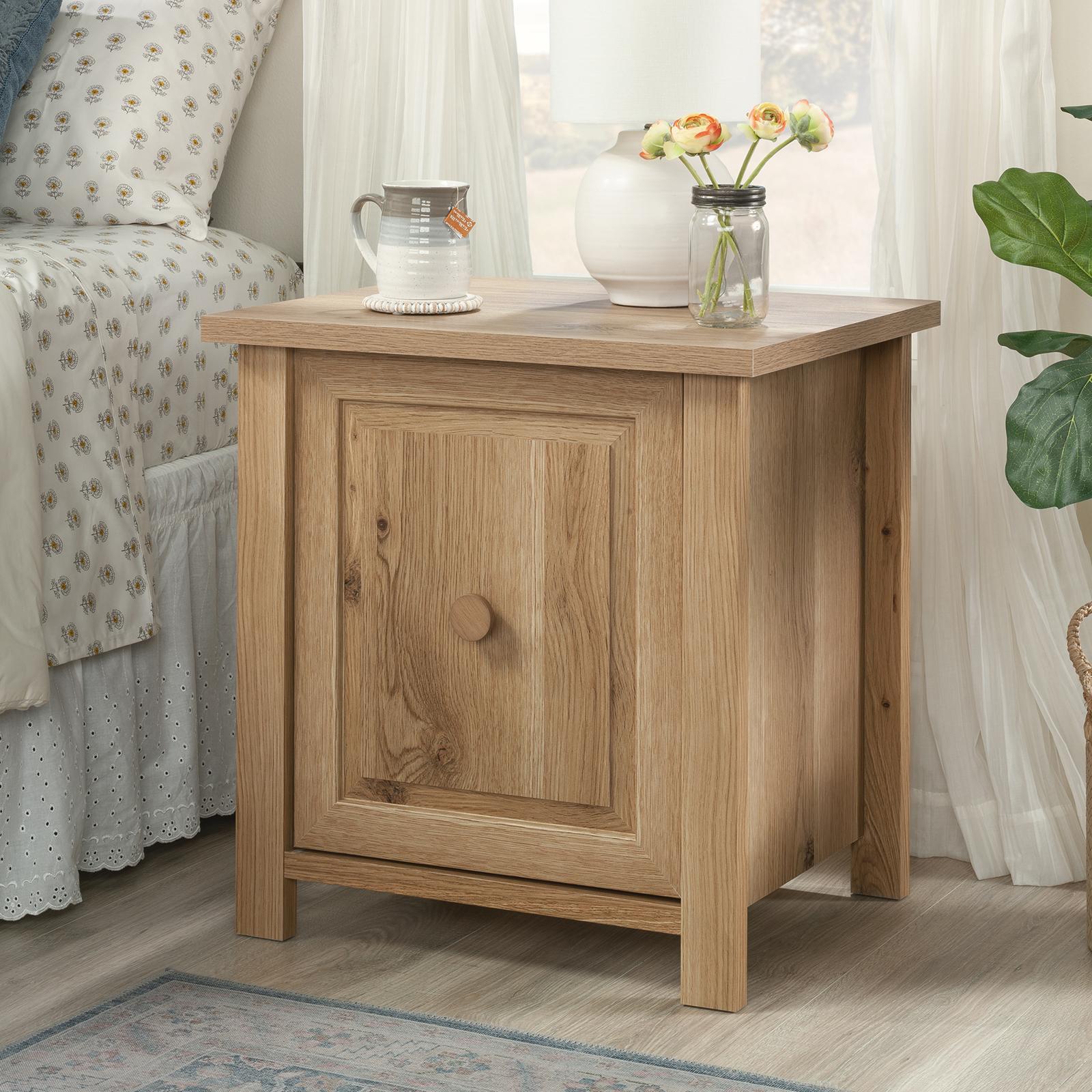 Discover Hillmont Farm, a farmhouse bedroom collection featuring a robust and adaptable country nightstand and occasional table that delivers cozy and casual vibes to the bedside or sofa. Boasting a resilient 1 in. thick top, this nightstand with door provides a dependable surface for all the nighttime essentials. Uncover concealed storage behind the reversible door, with plenty of space for books, phone chargers or a box of tissues, making this multi-purpose stand an instant room upgrade. Hide away all the hodgepodge to help keep the bedroom, living room or family room effortlessly clutter-free. The door can be conveniently adjusted to open left or right, catering to a personalized room layout. With a finished design on all sides, this nightstand with storage offers the flexibility to position it anywhere in the room. The charming Timber Oak finish of this bedside table with door exudes a rustic, country vibe, making it the ideal choice for a farmhouse-inspired decor. This country bedside table seamlessly combines functionality with enduring style to enhance the ambiance of any room.