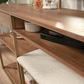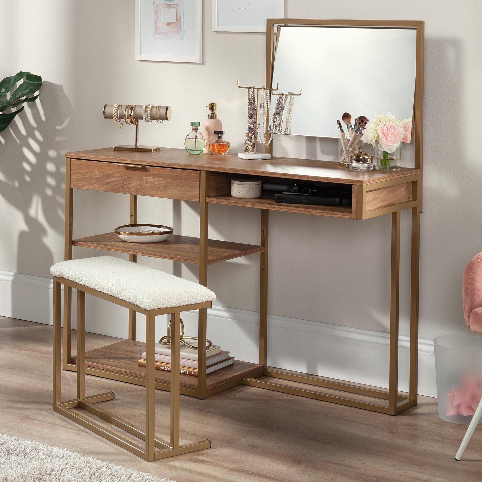 Get organized and improve your everyday routine with this bedroom vanity from the International Lux® collection. This makeup vanity with mirror is loaded with amenities – all designed for convenience and functionality. It includes a mirror that tilts, so you are always viewing at the perfect angle when applying lipstick, doing a skincare routine, or curling hair. This vanity with bench included has a cushioned seat and powder coated metal frame. A good bedroom vanity with storage, like this one, has hidden and open options. A drawer with metal runners and safety stops is perfect for items like eye shadow palettes, makeup brushes, and tubes of mascara. The cubbyhole area provides easy access to facial creams, hair styling products, or fragrances. Two open shelves (with one adjustable) provide flexible storage options for larger items like hair spray, lotions, curling iron, blow dryer, or candles too. This contemporary bedroom vanity has plenty of extra space on the top surface too. This bedroom vanity provides everything needed to get your day started right.