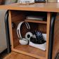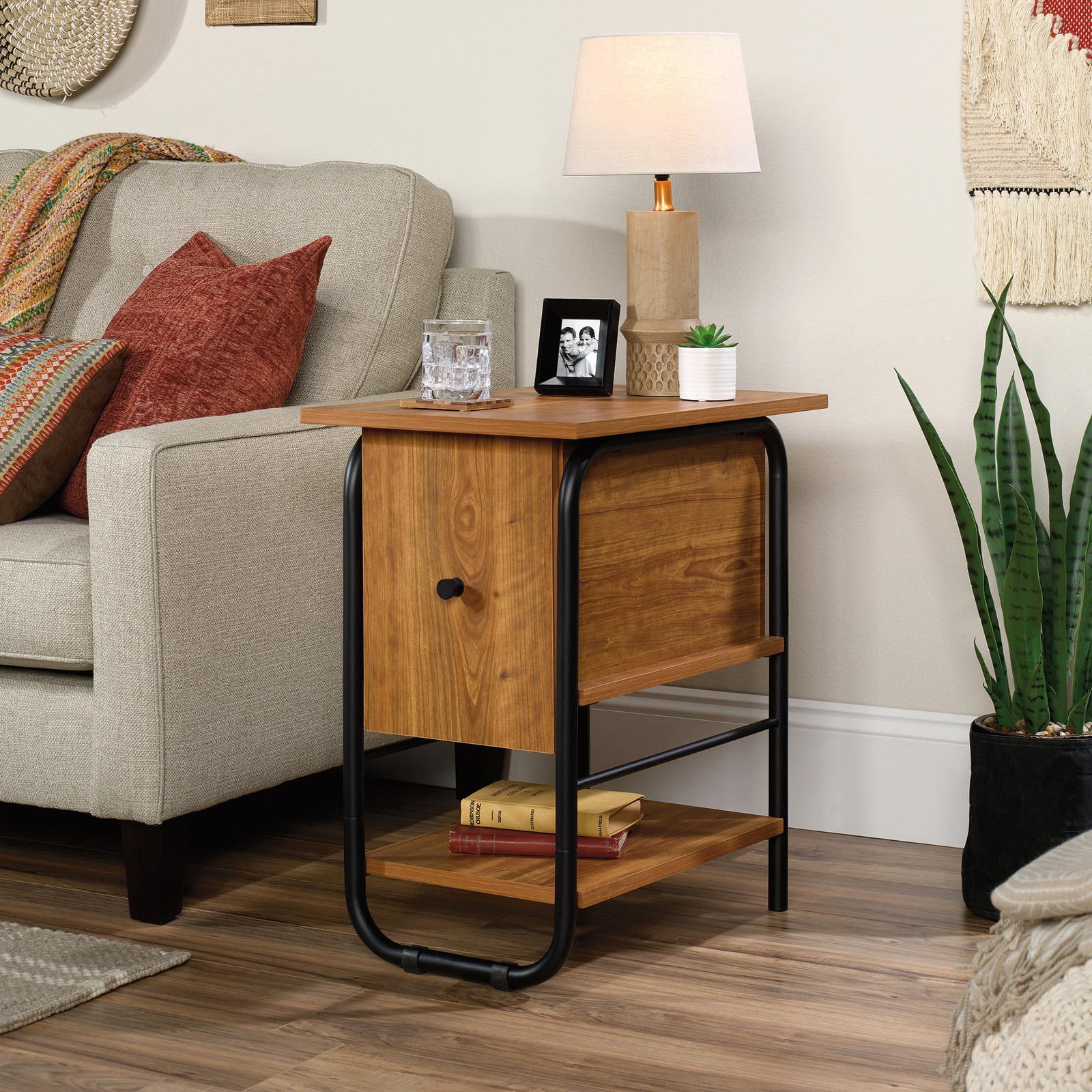 A unique side table that combines traditional design elements with modern flair. This side table with door from the Union Plain collection offers that, and much more. This shaker style side table features a hidden storage area behind the flip-down door, including an adjustable shelf to customize the storage space to your specific needs. Keep the remotes, box of tissues, phone chargers, or video game controls close by with the hidden storage area of this end table with door. A lower shelf for additional storage has room for a small organizing bin, books, home décor, and more. Finished on all sides for versatile placement, this side table with open shelf will look polished no matter how you arrange it. With a durable, powder coated metal frame in black and a soft Prairie Cherry finish, this mixed material end table with open shelf is here to change the game in living room furniture.