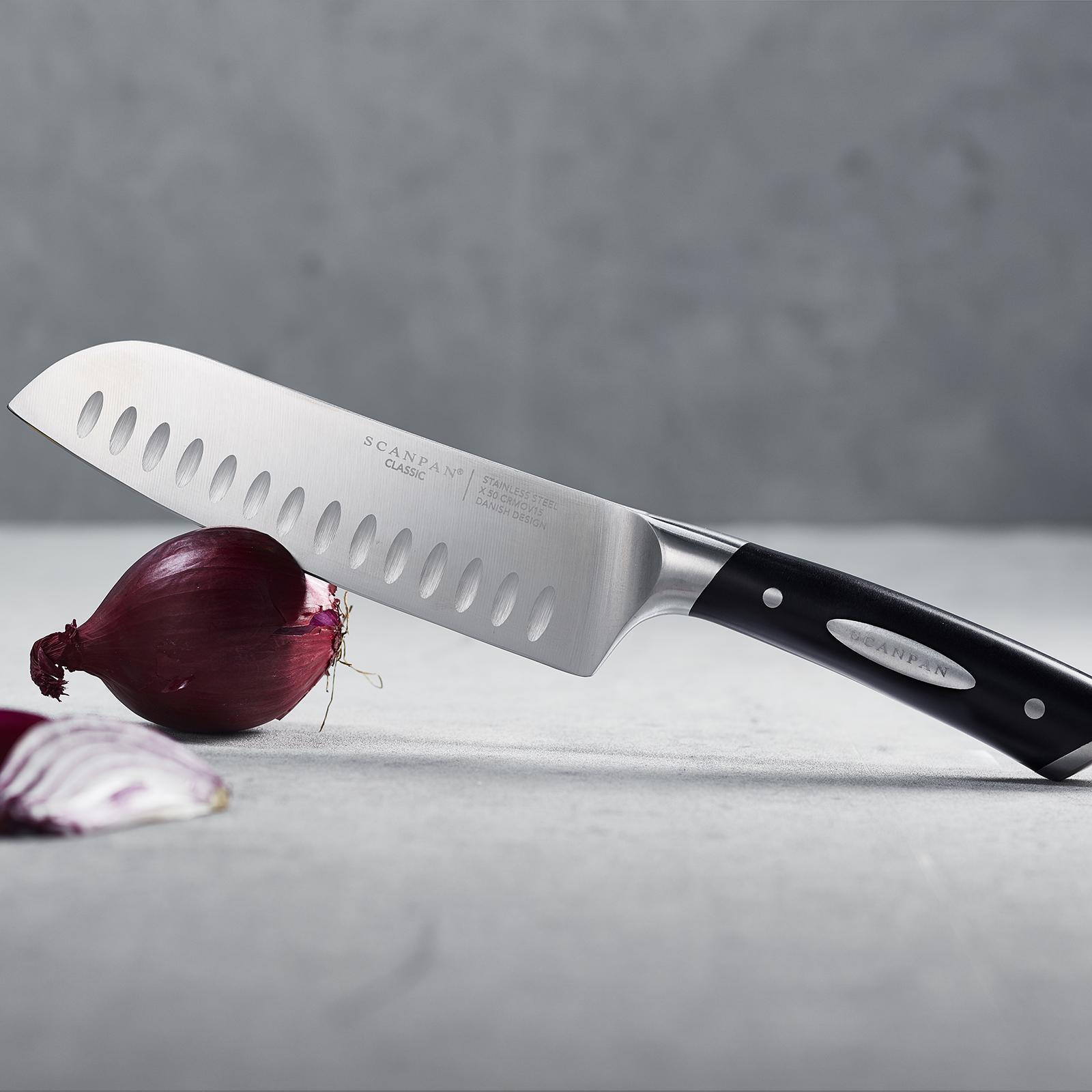 Scanpan Classic Knives are functional and elegant kitchen cutlery, which are made to handle the most demanding tasks. The new and upgraded Classic knife series features Danish design and modern production technology. The knives are manufactured with optimum weight and balance around the knife shoulder. The handle's ergonomic design provides a solid grip, even when weight is applied. The shape of the bolster allows the knife to be held in a pinch grip, where the thumb and index finger sit forwards on the spine of the blade, delivering enhanced efficiency and precision. Plus, the spine is rounded for greater finger comfort. The Classic knife series features a wide range designed to complete the majority of cutting tasks.