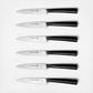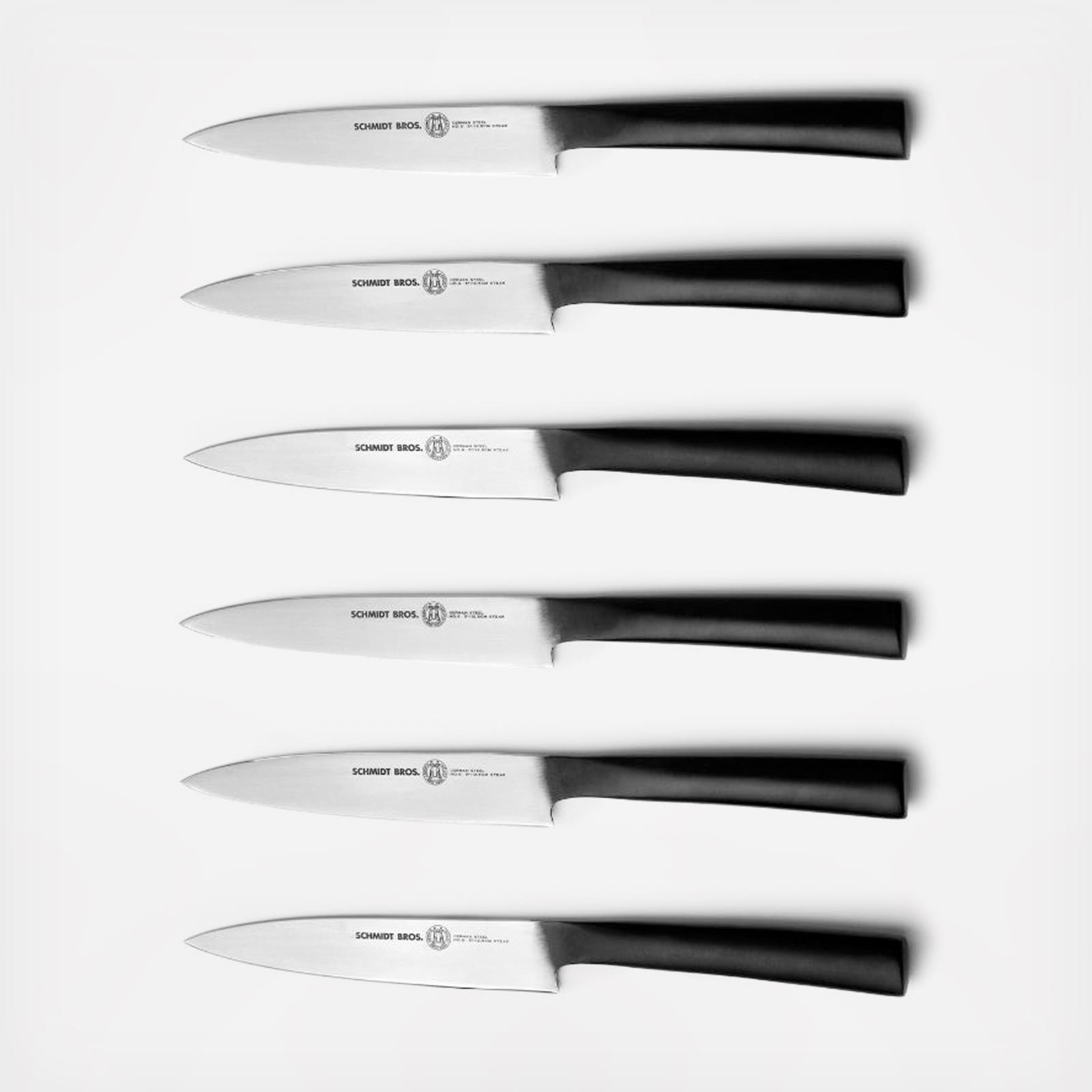 For best results, make your steak rare and your knives raw. These worldclass steak knives have ultra-sharp polished blades that contrast against raw, unpolished scorched steel handles. Each knife is made from a single piece of the finest 100% German Stainless Steel and have the patented Schmidt Brothers Curve so you can cut through that beautiful beef more easily. Raw looking steak knives. Rarer craftsmanship.