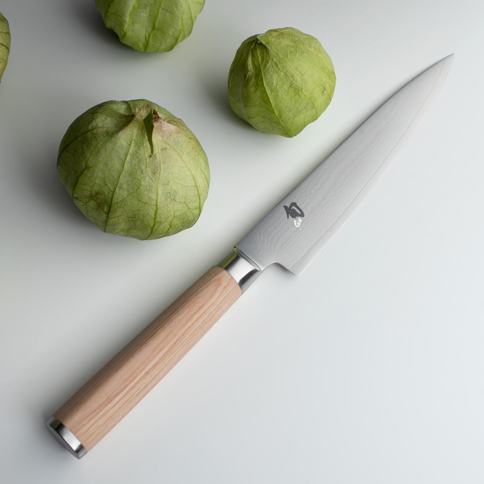 The Shun Classic Utility Knife is multipurpose and very, very handy. The utility knife has a narrow, straight blade that's perfect for a multitude of small tasks where more precise cuts are needed. Trimming green beans, cutting cauliflower florets, cutting sandwiches in half—all are tasks well suited to the Shun Classic Blonde 6-inch Utility Knife. Its very slightly curved belly enables it to do moderate rocking cuts. It's nimble enough to peel an onion in hand, then slice it up in short order. Utility knives are sometimes called sandwich knives because they work well on almost everything that goes into a sandwich—from thin-skinned vegetables such as tomatoes, to meats and cheeses.