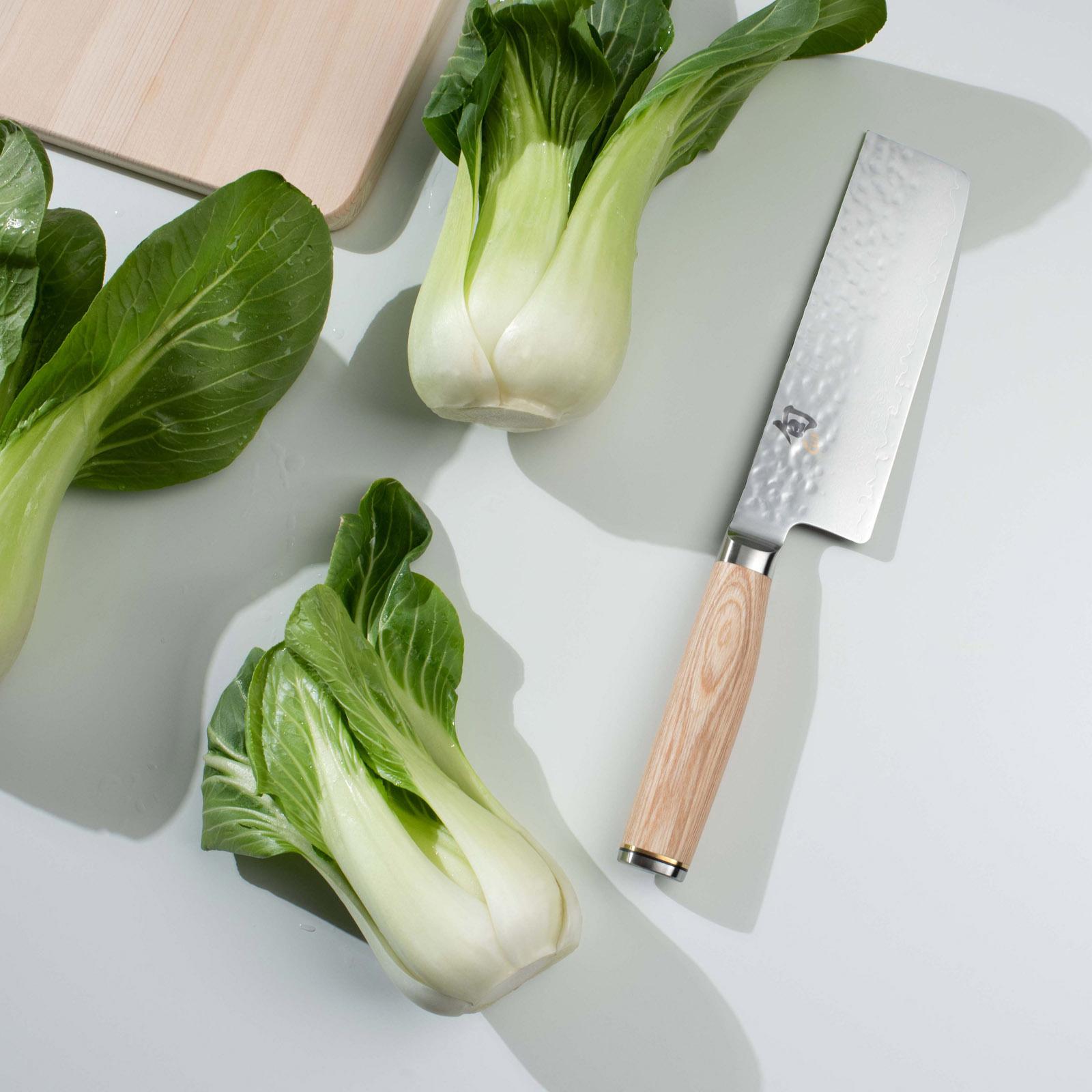 Quite simply, “nakiri” is Japanese for "vegetable knife." If you haven't used Japanese-style knives before, the nakiri is sure to attract your attention due to its interesting shape. Yet this blade shape is quite practical, too. With its blunt tip, the Premier Nakiri is safer to use in the kitchen, but without sacrificing any of the slicing and dicing power you need when processing vegetables. Because of its straight blade, edge, and spine, the nakiri isn't rocked like a chef's knife. Instead, use a push cut by moving the knife down and forward while keeping the edge parallel to the cutting surface. If you cut vegetables for salad or stir-fry, you will simply love using the Premier Nakiri.