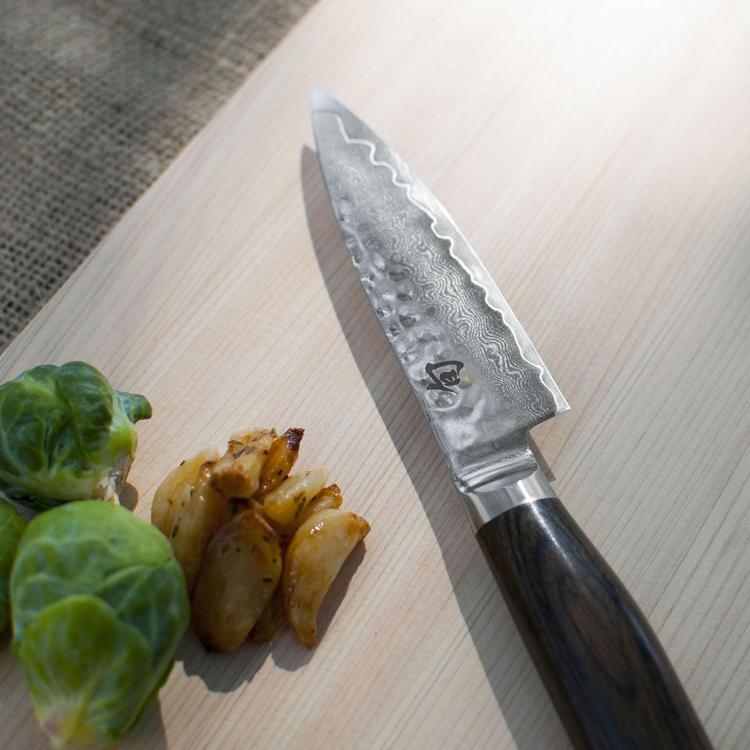 The paring knife is an indispensible kitchen prep knife. For peeling, trimming, making decorative cuts, or even for chopping small foods like shallots or garlic, the small size of the paring knife gives you complete cutting control. Since every kitchen needs a paring knife - and since you’ll use it just about every time you cook - it makes sense to own a paring knife you can love. A thin lightweight blade and a razor-sharp edge make every paring task a breeze. The contour on the bottom of the handle ensures an excellent grip whether held by the handle or in a pinch grip.