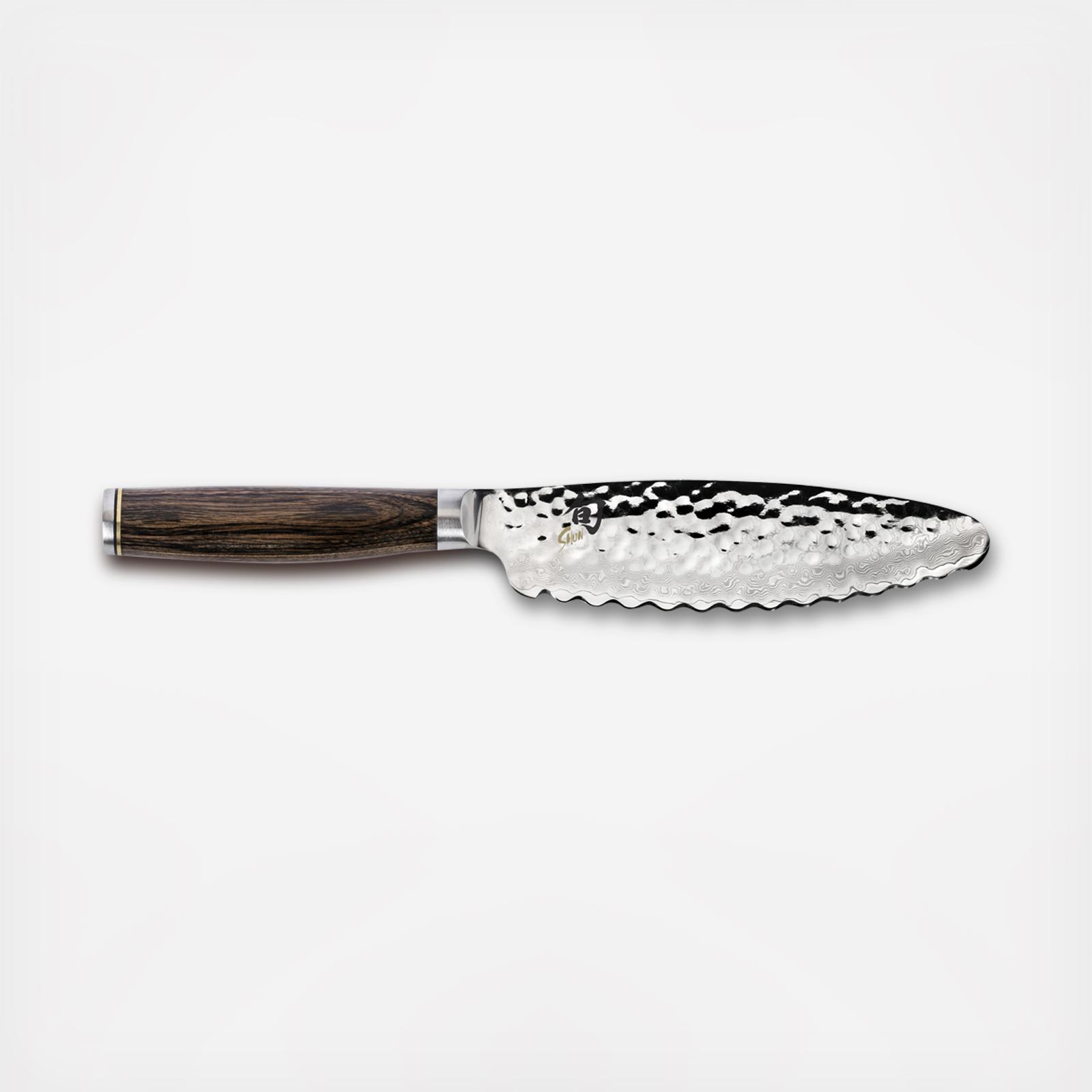 It looks unusual, but that is simply because it is unusually useful. The cutting edge of the Shun Premier Ultimate Utility's has a low-frequency serration that makes this knife perfect for slicing delicate thin-skinned fruits and vegetables. The knife's curved belly enables you to rock it on the cutting board, while the wide blade with its rounded tip also makes it great for spreading mayo on a sandwich. When you cut the sandwich in half, the gentle serrations glide through without tearing. It may not look traditional, but the Shun Premier Ultimate Utility Knife is about performance where it counts—in your kitchen. Try it and you will be amazed at how often you find yourself reaching for this multifunction knife.
