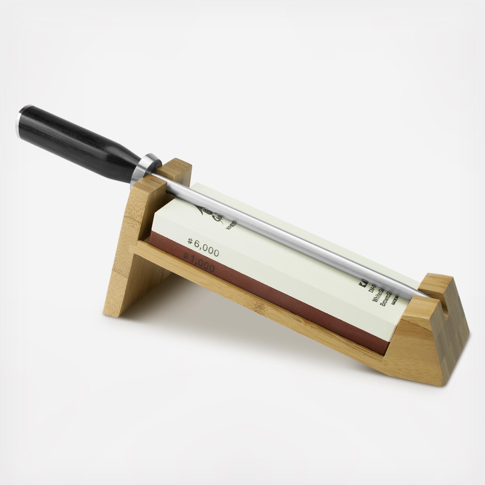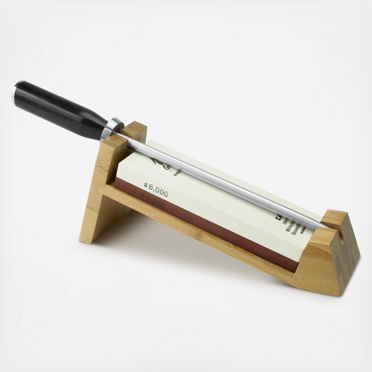 The Shun 3-Piece Sharpening System is the easy way to learn how to sharpen your knives yourself using a whetstone. Because of the slant of the bamboo stand, all you need to do to ensure your knife is at the proper angle when sharpening is to keep the blade flat and parallel to the working surface as you pull it across the stone. Once you’ve sharpened your knife, you can maintain the edge for a longer period of time by honing regularly. The included honing steel can be used in the stand or on its own. The Shun Combination Whetstone is a double-sided Japanese waterstone. You will need to thoroughly soak this whetstone before sharpening.