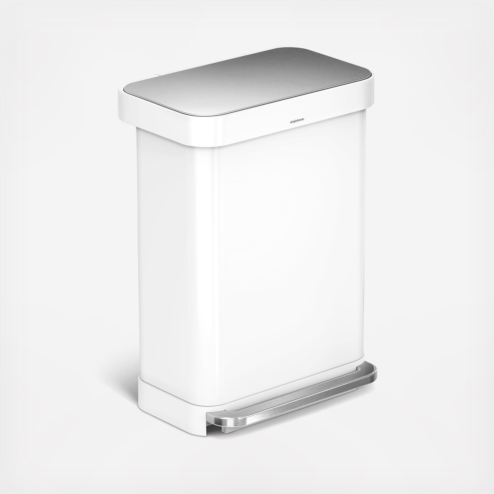 simplehuman's new stainless steel rectangular step can features an innovative 'liner pocket' that stores and dispenses liners from inside the can for a faster liner change. The stainless steel liner rim grips the liner and keeps it hidden. And with no inner bucket, there's more space for trash. Strong wide steel pedal is designed to last, and simplehuman's patented lid shox technology ensures a smooth, silent close every time. Includes an all natural odorsorb pod that fits discreetly under the lid of your simplehuman can to eliminate trash odors for 45 days.