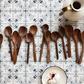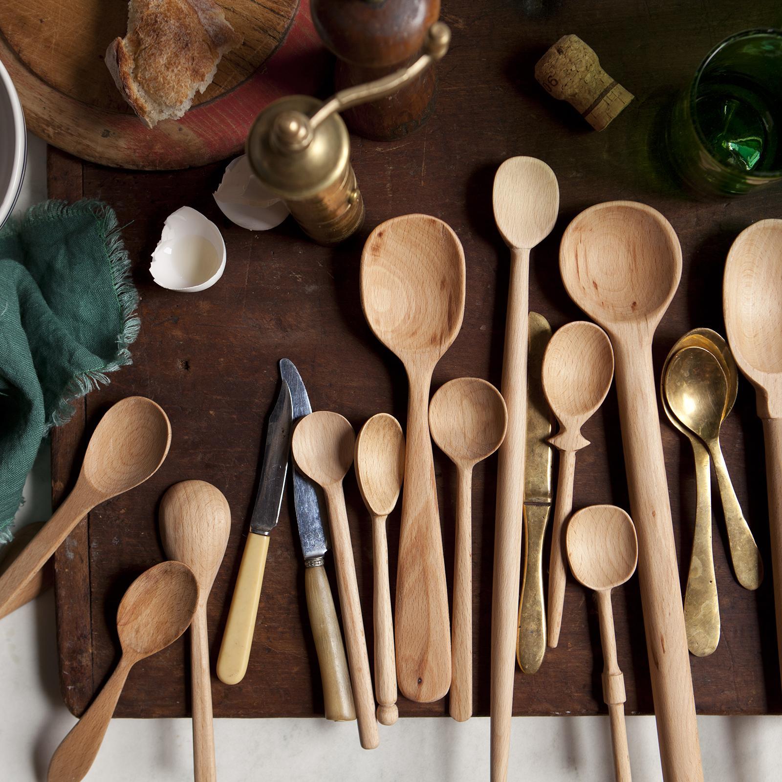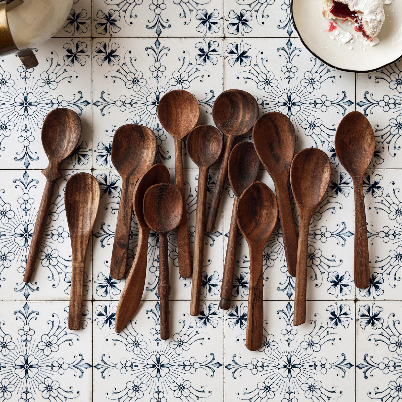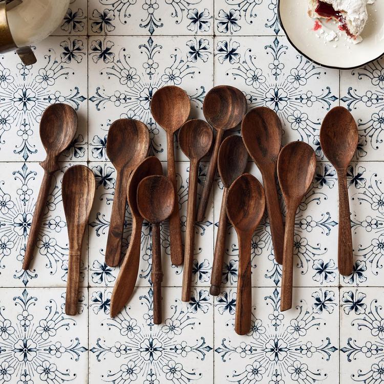The wooden spoon is a kitchen workhorse, and we’ve been amassing bouquets of well-worn examples for years. Our Baker’s Dozen Wood Spoons sets are an instant collection of thirteen assorted styles with no two alike, replicated from some of our favorites. The large spoons are great for cooking and serving, and the small spoons are ideal for spices, sauces, and desserts. Each spoon is hand-carved from beautiful black siris hardwood. The color will vary from piece to piece. Both large and small are sold packaged as sets in a printed muslin pouch.