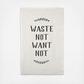 Inspired by an English towel, the Waste Not, Want Not towel is made from pure linen to avoid surface lint when drying delicate china and glassware. Individually printed using silk screens, each towel is cut from running yardage that comes off the loom with selvage sides before we hem it by hand.