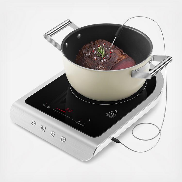 Contemporary Portable Induction Cooker with removable temperature probe: Combines high performance with sleek design for versatile, precision cooking. It features 9 power levels plus a Boost mode, a responsive slider for power control, and a countdown timer up to 99 minutes, along with a convenient preset KEEP WARM function. The modern LED touch display complements its elegant design, which includes a glass ceramic surface, matte plastic housing, aluminum panel with a brushed finish, shiny chamfered edge, and the iconic chromed SMEG logo. It supports pan sizes from 5 to 10 inches and includes a smart external temperature probe (104–210°F) with accessory and pot clips. Two probe programs—Target and Timer—offer ideal settings for everything from sous-vide and slow cooking to chocolate melting and core temperature cooking. The included My Smeg Assist QR code provides additional support and guidance.