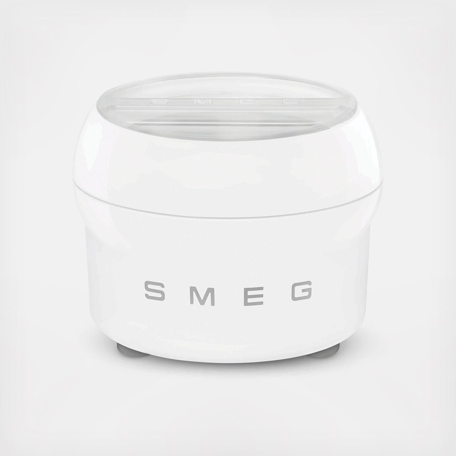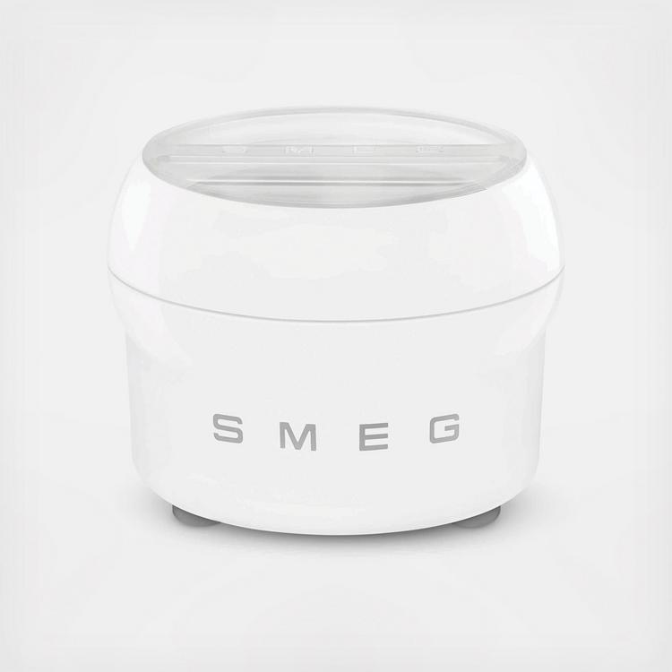 SMEG Ice Cream Maker with Beater in POM, Beater adaptor in ABS, Cooling container ring adaptor with funnel in ABS, and Spatula in ABS. Double wall cooling container, inner part in steel. Cooling container into the stainless steel bowl of SMF02 and SMF04.