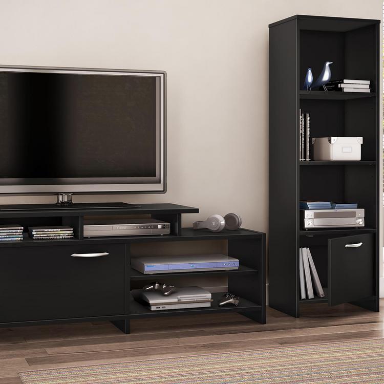 With its contemporary style and straight lines, this versatile, all-purpose shelf bookcase from the Step One collection will blend perfectly with the other furniture in your room. It can perform multiple functions as the ideal media tower for holding your DVDs and game console, or simply as a handy bookcase. This piece features three open storage spaces, separated by two adjustable shelves, and a closed storage space at the bottom, so you'll have a neat, well-ordered room.