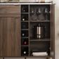 This bar cabinet has all the storage space you need! It features a bottle rack in the center, where you can keep your favorite wine bottles (6), and a small drawer for organizing all your mixology accessories. The wide slide-out storage space on the left, which has a fixed shelf, is the ideal size for all your liquor bottles. Behind the door on the right are three spaces divided by one adjustable shelf and one fixed shelf: perfect for all your wine glasses and champagne flutes. So all your things will be organized and located in one place. Everything you need to simplify your life!