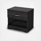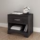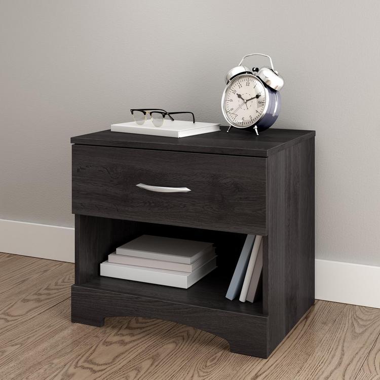 This nightstand with a cutout kickplate will give your bedroom a contemporary and distinguished look. In order to maximize bedside storage it features an open storage space and a drawer decorated with an elegant metal handle. With a sturdy table top suitable for a lamp, cell phone and glass of water, the bedroom cabinet meets all your storage needs.