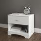 This nightstand with a cutout kickplate will give your bedroom a contemporary and distinguished look. In order to maximize bedside storage it features an open storage space and a drawer decorated with an elegant metal handle. With a sturdy table top suitable for a lamp, cell phone and glass of water, the bedroom cabinet meets all your storage needs.