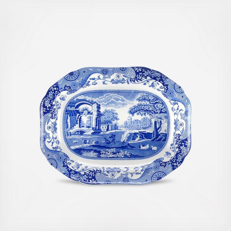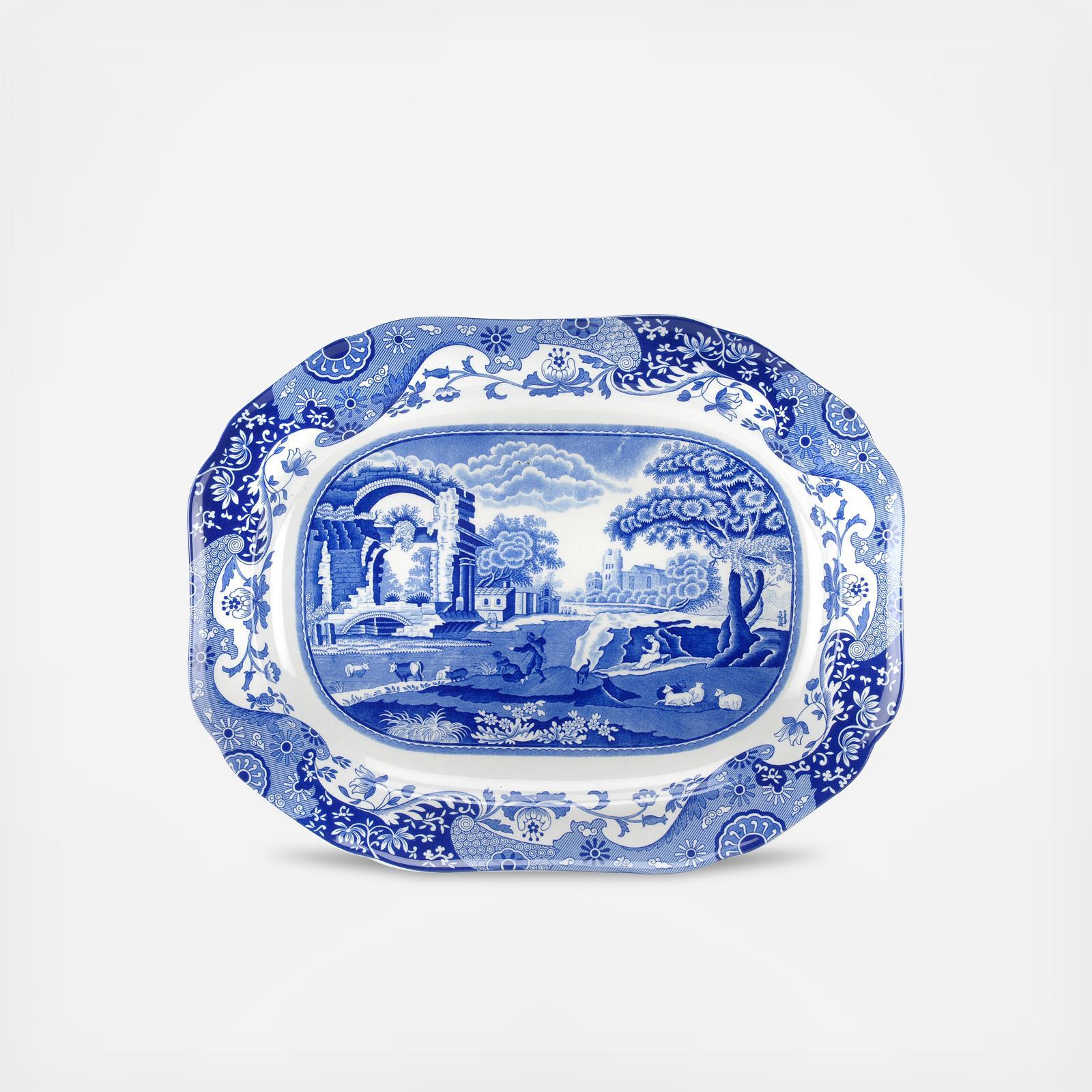 This 14 inch Oval Platter is a great size for serving all sorts of foods. Blue Italian, which has been in continuous production for nearly 200 years, epitomizes the traditional blue and white for which Spode is famous. Framed by an 18th century Chinese border, the central scene of Italian ruins was inspired by a 17th century drawing.