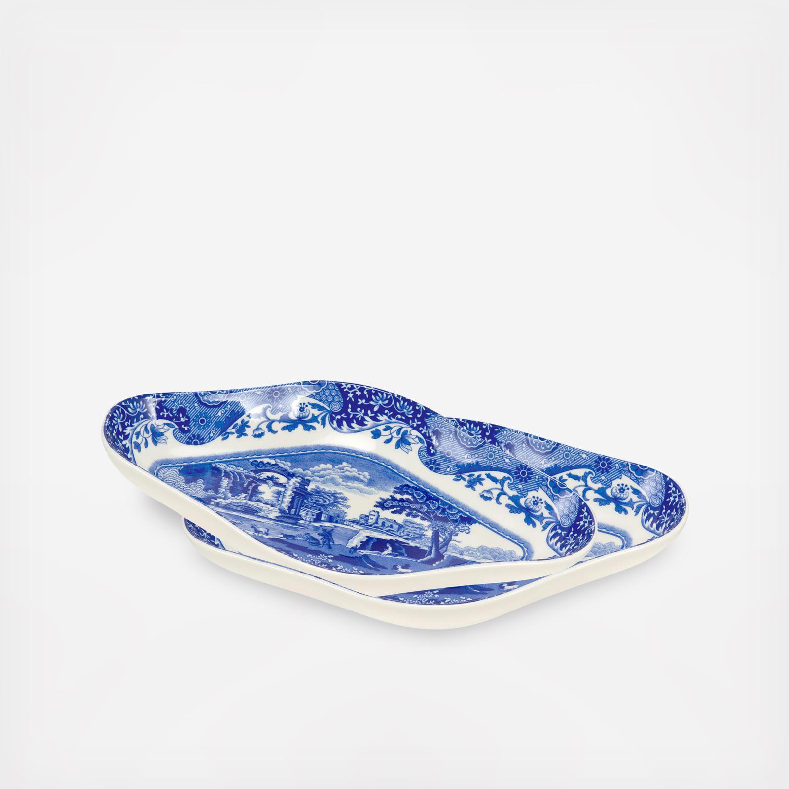 Need a dish for sides or condiments? The 8.5 inch x 5.5 inch, diamond-shaped Pickle Dish will serve the purpose well. Blue Italian, which has been in continuous production for nearly 200 years, epitomizes the traditional blue and white for which Spode is famous. Framed by an 18th century Chinese border, the central scene of Italian ruins was inspired by a 17th century drawing.