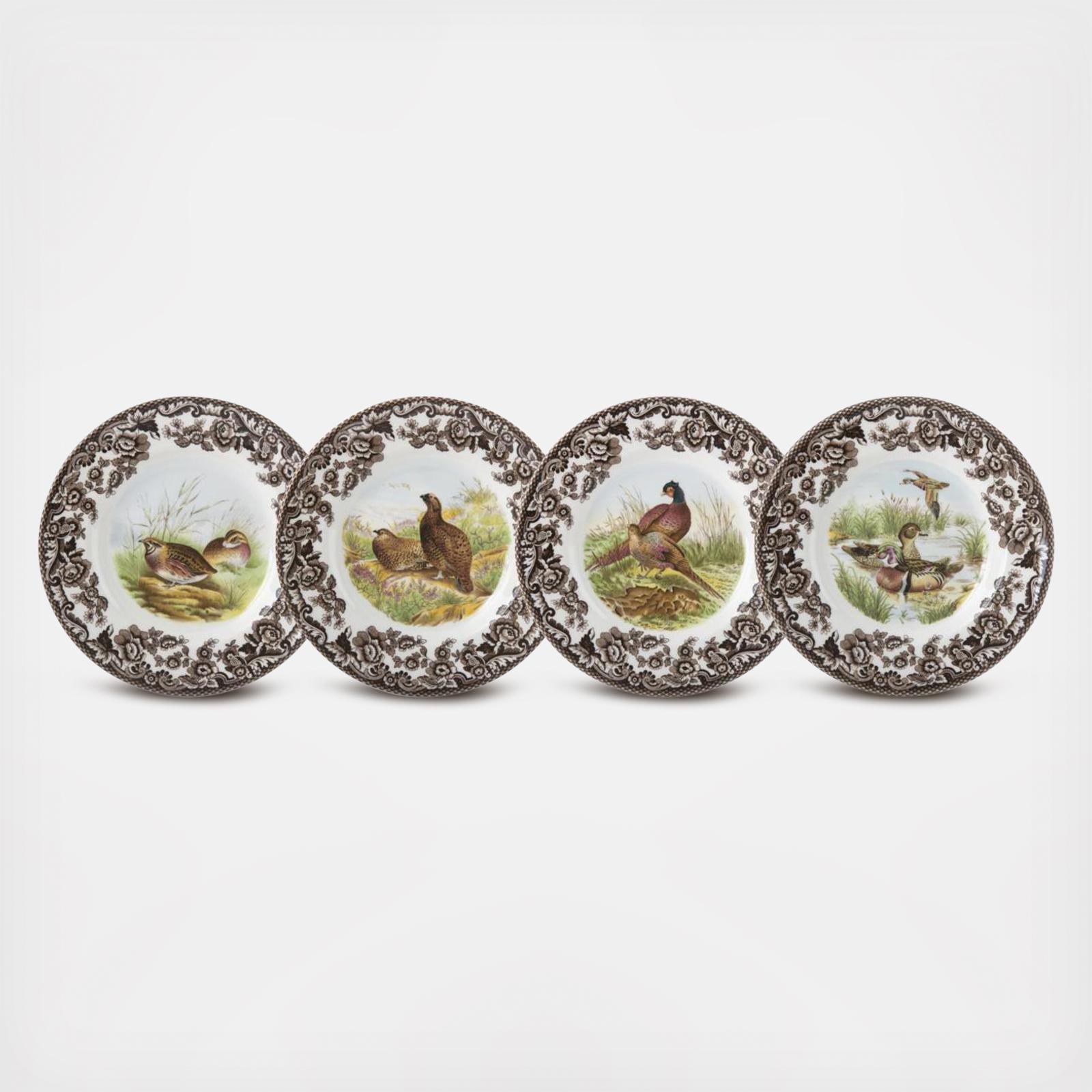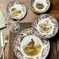 Introduced in the US in the 1990's, Woodland's designs are rooted in the traditions of hunting for game and its elaborate presentation on the table. Central to the charm of the pattern are the striking studies of different animals framed by the British Flowers border which dates back to 1831. Their woodland is a tribute to american wildlife. These beautiful rendering's can be mixed and matched together to create a wonderfully distinctive dining experience. This set of four canape plates feature a Red Grouse, a Pheasant, a Quail, and a Wood Duck.