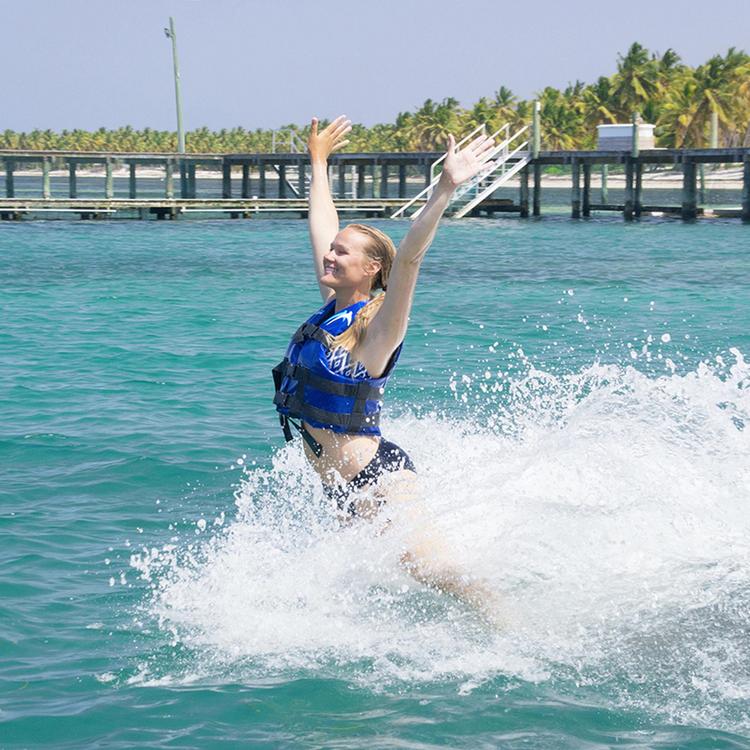 This program includes 50 minutes of water time with the dolphins. This program is designed for up to 12 people per group and there will be one dolphin per group. This program is designed for swimmers from an intermediate level and up.