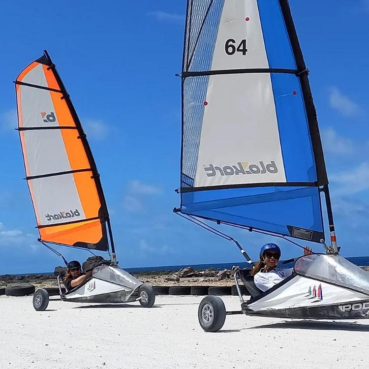 Bonaire Landsailing Adventures offers unique, safe, adrenaline-filled, eco-friendly fun for everyone. All instruction is provided. Its really easy to learn - 15 minutes and you're sailing your own blokart around a beautiful track on the shores of the Caribbean Sea. A blokart is a three-wheeled kart with a sail. You control the speed and the direction.
