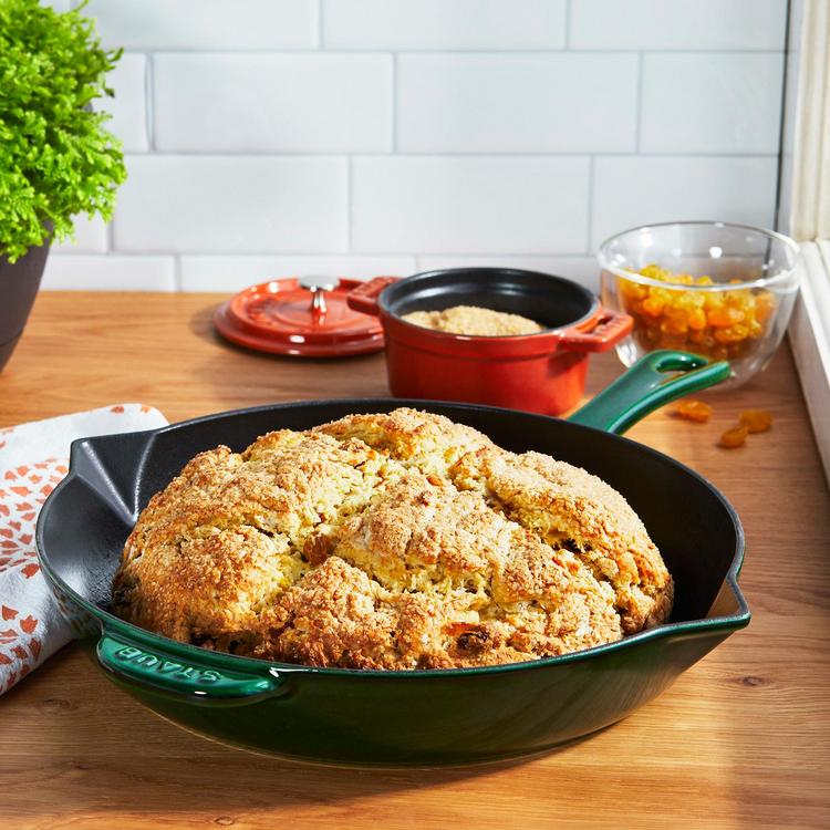 Proudly made in France, Staub has been the benchmark for premium cast iron cookware. Like all Staub fry pans, the Staub Traditional Skillet browns foods beautifully. Whether you’re searing chicken breasts, frying bacon, or caramelizing carrots, the Staub interior imparts texture, promoting exceptional browning and searing, without sticking. And because cast iron offers steady, even heat distribution, the temperature of the pan won't drop as you cook. Like a sauté pan and fry pan in one, our Traditional Skillet boasts all the features of a fry pan combined with higher, straighter sides, which means less splatter on the stovetop. Staub enameled cast iron cookware is the choice of the world's best chefs. With exceptional durability, it’s perfect for day-to-day use in both gourmet home kitchens and prestigious restaurants around the world. Each piece transitions beautifully from the kitchen to the table. Built to last a lifetime, these heirloom pieces can be passed from generation to generation. Textured interior ensures exceptional browning. Enameled cast iron is easy to clean and doesn’t require seasoning. Durable cast iron construction boasts incredible heat retention and distribution. Pouring spouts for easy fat removal. Raised sides help prevent splatter and spills.